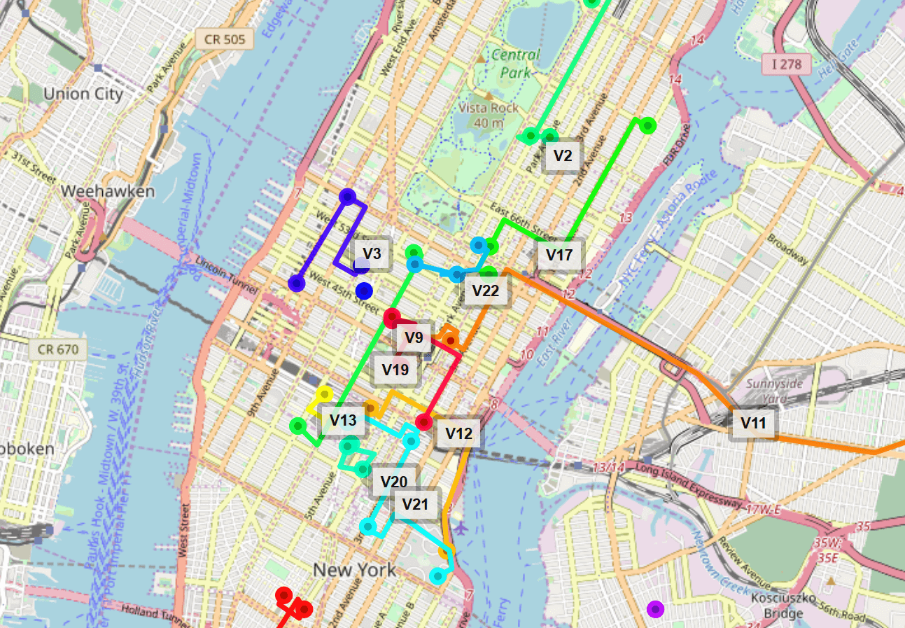 This model uses delay optimisation, on-board limits and pickup-delivery jobs. The following image shows output routes: