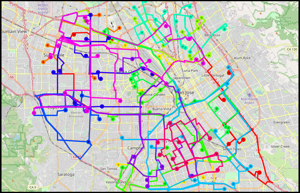 Please read the readme.txt in the directory for a detailed explanation of the model and how to run it. It has 250 passenger transportation jobs in San Jose, California (all data is artificial). Passengers (a) either need to be picked up or dropped off at a certain time, (b) have limits on their on-board journey time, and (c) are not allowed to wait on the stationary vehicle outside another patient’s home for the other patient’s pickup time (same for dropoff times). These constraints can only be solved by optimising pickup times, which ODL Live does by telling the driver to delay pickups sometimes and take a small break instead.